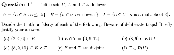 e) False, 6 is an element of E and T