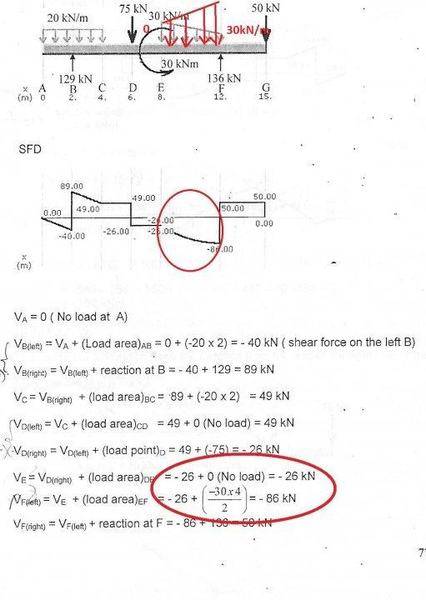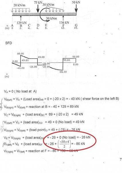 - One participant questions why the shear force at point E is not calculated as -26 + (-30*4/2) and suggests that it should be -86 kN.