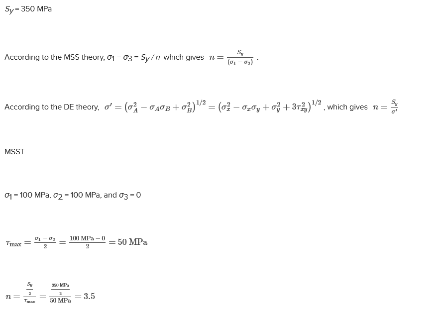 - A ductile hot-rolled steel bar has a minimum yield strength in tension and compression of 350 MPa. Using the distortion-energy and maximum-shear-stress theories, determine the factors of safety for the following plane stress states.