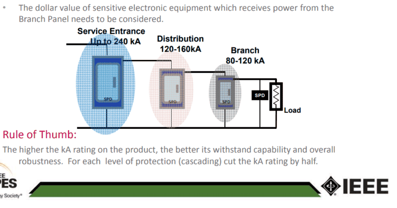 I have read it over and over. But remember my situation is i'll put a high surge capacity (50kA) Type 2 at the equipment 5 meters away. Since my SPD has high surge current capacity, then it's not sensitive to the current. But I'm concerned about impedance and planning to add 5 meters of wire in loop (see pic below) just to meet the 10 meters. And I'm asking to what extend can the SPD lower the voltage for 10 meters impedance versus just 1 inch wire (between 2 SPDs put side by side at breaker panel where the 2nd farther SPD 1 inch away would only see the 1 inch wire impedance and not see the longer service entrance wire). May I know the formula to relate voltage and impedance and why longer wires can bring the voltage down? Thank you.