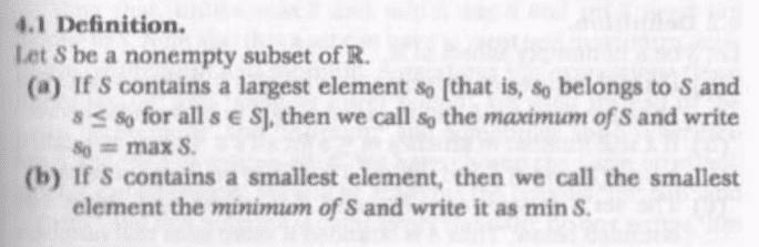 I was reading through the early chapters of Ross' book on analysis in the section covering the completeness axiom. See below.