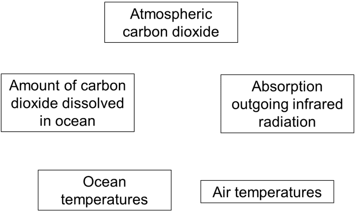 a) As carbon dioxide levels increase in the atmosphere more outgoing infrared energy is absorbed which increases air temperatures and therefore ocean temperatures. As ocean temperatures increase carbon dioxide is released to the atmosphere because less carbon dioxide can be dissolved in seawater (i.e. the solubility of carbon dioxide decreases with higher temperatures). Draw the appropriate arrows between the boxes to complete the feedback loop described above.
