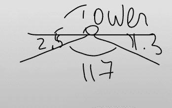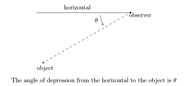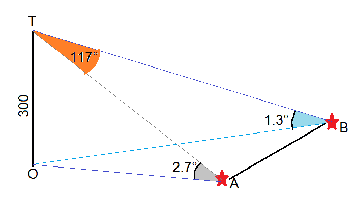 I found the correct distance, no issues here (it's around 17455), but how can the angle between two lines of sight be equal to 117°, if one angle of depression is 2.5° and another is 1.3°, which if combined are only 3.8°.