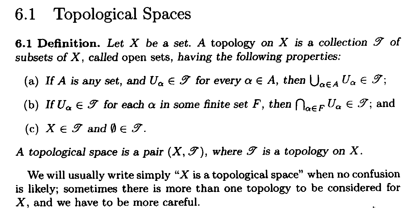 I am reading Chapter 6: Topology ... ... and am currently focused on Section 6.1 Topological Spaces ...