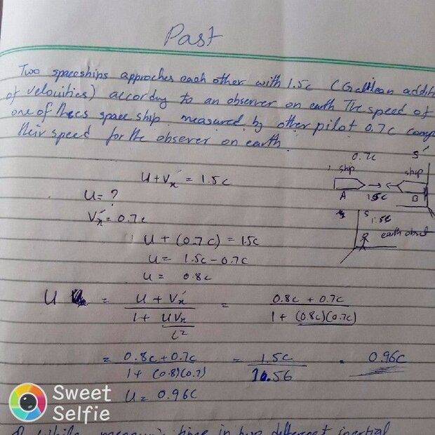 - Two spaceships approach each other with 1.5 c (Galilean addition of velocities), according to an observer on earth. The speed of one of these spaceships measured by other's pilot is 0.75 c. Compute their speeds for the observer on earth.