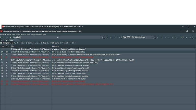 Hi all. I'm working on my final project for a class. The assignment is to have a linked list of personal records, and then do some things with it. Right now I'm working on the linked list class "List.h". I've implemented a Person class "Person.h" as a composition of 3 subclasses "Address.h", "Date.h" and "Name.h". I've attached all of these as text files (I'm not allowed to attach .h files?). I'm able to compile "Address.h", "Date.h", "Name.h" and "Person.h" without any issues. But when I'm trying to compile "List.h" I get some serious compilation errors (attached). The most serious is the one that says my Node struct is implicitly deleted. I need some help on how to solve this without re-doing everything I've already done. Please help.