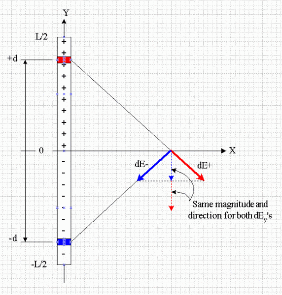 - Participants discuss the setup of the integral for calculating the electric field and express confusion about the integration limits and the resulting values. There are questions regarding the treatment of charge elements above and below the x-axis, particularly how their signs affect the overall calculation. Some participants suggest breaking the integral into segments to account for these differences.