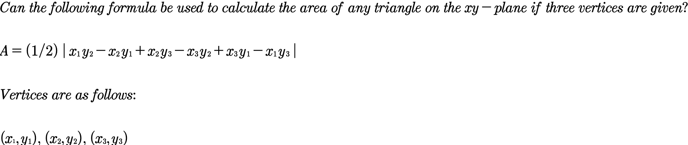 The forum discussion centers on the unique area of a triangle formula, emphasizing its correctness and utility. Participants highlight that the proof relies on linear algebra concepts, particularly determinants. The conversation also touches on varying levels of familiarity with linear algebra among contributors, indicating a gap in understanding for some. Overall, the formula is recognized as both interesting and practical for mathematical applications.