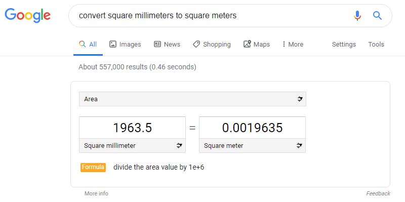 Online converters work. Just have to use the right units. I Googled "convert square millimeters to square meters". Without leaving the Google page, a converter was displayed. I keyed in 1963.5.