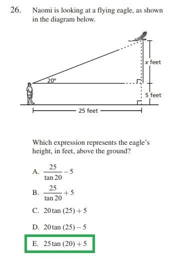 The discussion focuses on solving a trigonometric problem involving the tangent function. The equation derived is tan(20) = x/25, where x represents the height of an eagle above a person's eye level, and the base of the triangle is 25 feet. To find the total height of the eagle above the ground, an additional 5 feet must be added to the calculated height (x). This highlights the importance of understanding the context of trigonometric measurements in real-world applications.