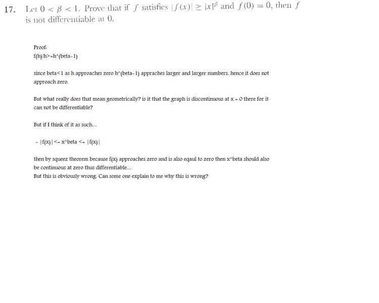 - Participants explore the implications of the function's behavior as it approaches zero, questioning its differentiability and continuity. There are discussions about the meaning of various inequalities and how they relate to the function in question. Some participants express confusion regarding the interpretation of absolute values in inequalities.