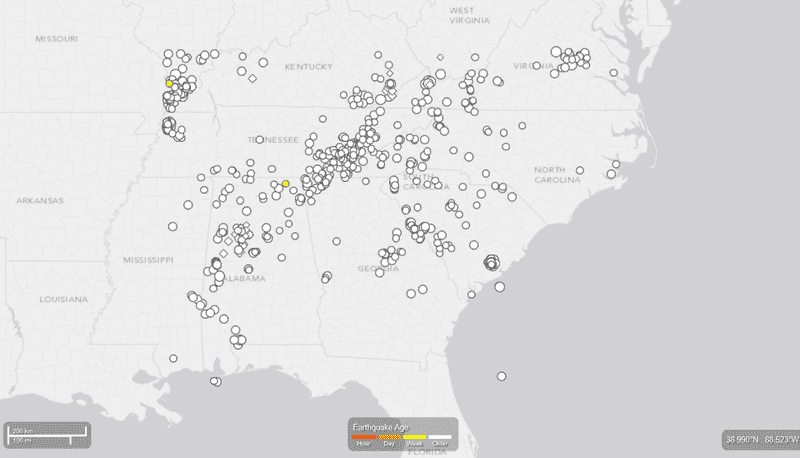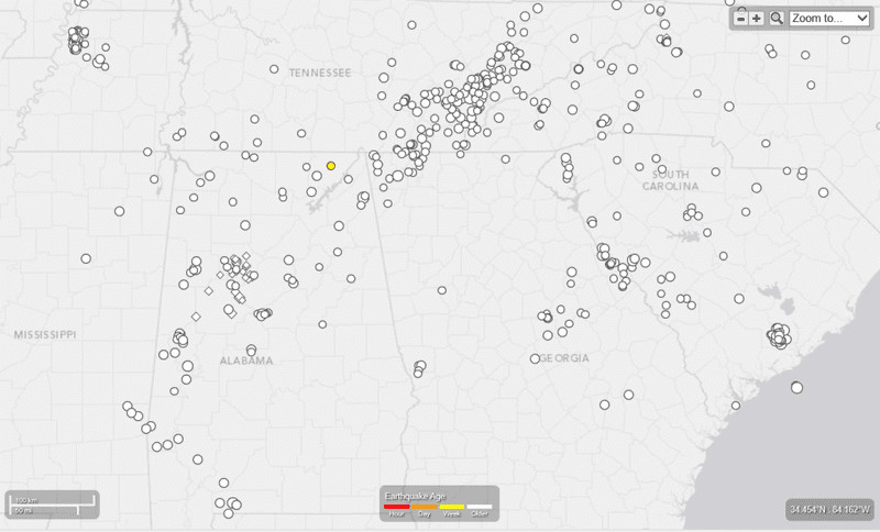 Attached image shows locations of earthquakes in SE US from Jan 1, 1970 through today. The zoomed in image shows about 500 earthquakes. The zoomed out image shows 671 earthquakes.
