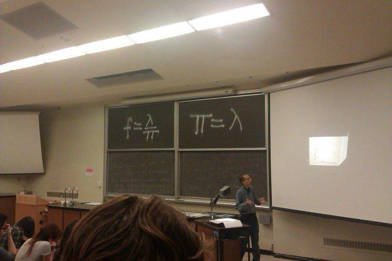 Someone has spray-painted (no idea why) these formulas on the blackboard. I assume they are from the math class that is held before our physics class. I'm guessing it to be calculus or mathematical logic but I don't know.