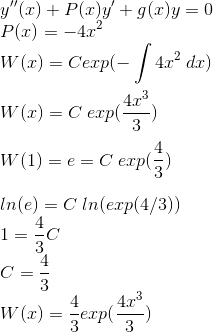This discussion focuses on using Abel's identity to determine the Wronskian of a differential equation. The key equation presented is W(x) = C exp(-∫ P(x) dx), where P(x) is defined as -4x². The correct application of the integral leads to W(x) = C exp(∫ 4x² dx), highlighting the importance of maintaining the correct signs throughout the calculation. The conversation emphasizes the necessity of careful algebraic manipulation in solving differential equations.
