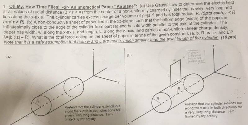 B) a nonconductive sheet of paper lies in the xz-plane such that the bottom edge (width) of the paper infinitesimally close to the edge of the cylinder from part (A) and has its width parallel to the axis of the cylinder. The paper has width,W, along the x-axis, and length,L, along the z-axis, and carries a non-uniform linear charge density ([z]-R) (again the [] represent abs value). What is the total force acting on the sheet of paper in terms of the given constants (a,b,R,w,ε0 and L)