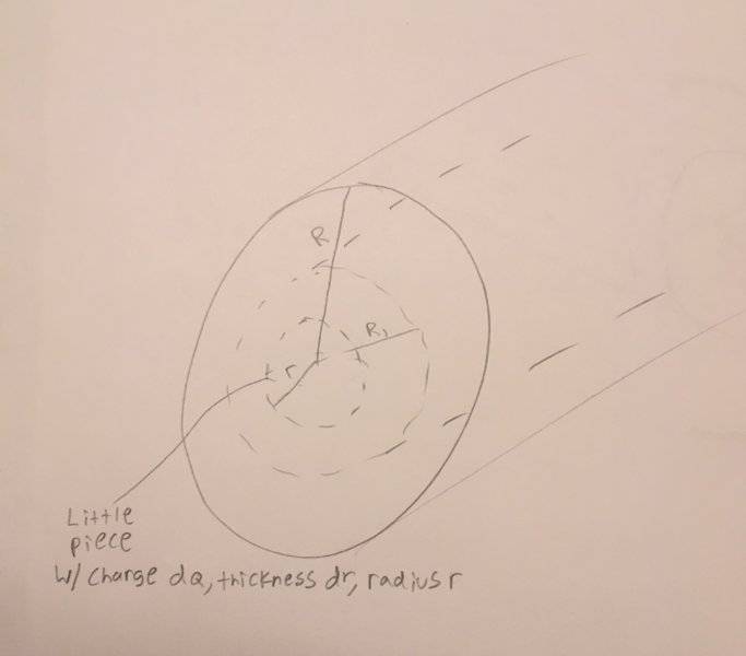 My first thought is to look at a small segment of the cylinder with radius, r, thickness, dr, and charge, dQ.