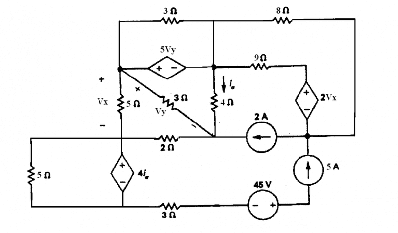 This discussion focuses on applying Kirchhoff's Current Law (KCL) and Kirchhoff's Voltage Law (KVL) to determine the voltage across two ideal current sources of 2A and 5A. Participants emphasize the importance of eliminating non-contributing resistors, specifically a 5Ω resistor in parallel with a 4Io source and a 3Ω resistor in parallel with a 5Vy source, to simplify the circuit analysis. The discussion highlights the necessity of labeling mesh currents for clarity in calculations. The use of Ohm's Law is also implied as a fundamental tool in solving the problem.