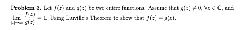 The discussion revolves around the application of Liouville's theorem in complex analysis to demonstrate the equality of two entire functions, f(z) and g(z). Participants explore the implications of limits at infinity and the boundedness of these functions.