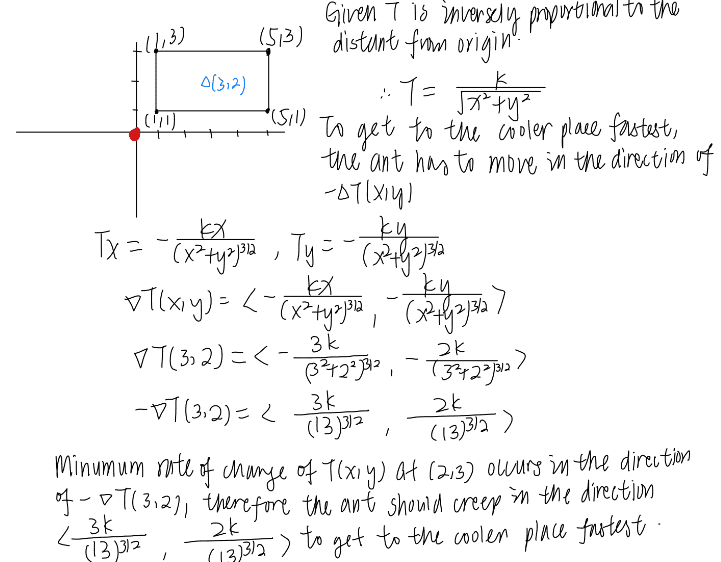 - Suppose there is a rectangular metal plate in the Oxy-plane with vertices (1,1),(5,1),(1,3) and (5,3). There is a heat source at the origin that heats the plate. Suppose the temperature at a point in the plate is inversely propotional to the distance of this point to the origin. Suppose there is an ant at the point (3.2). In which direction should the ant creep such that it gets to the cooler place fastest?