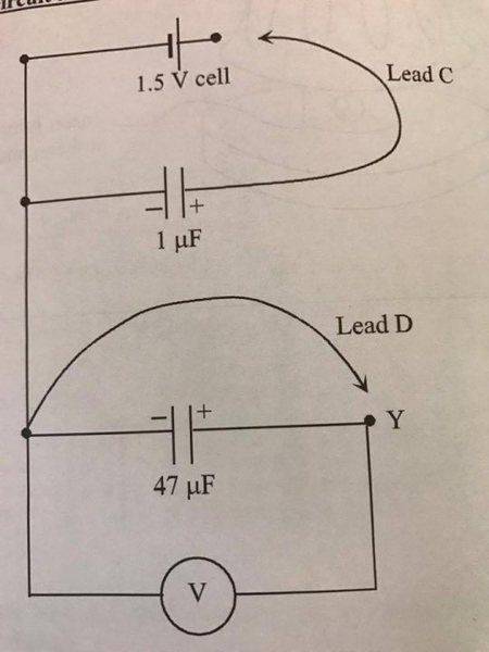 2. Connect lead C to the positive terminal of the cell to charge the 1.0 microFarad capacitor. Then connect lead C to point Y in order to make the two capacitors share the charge.
