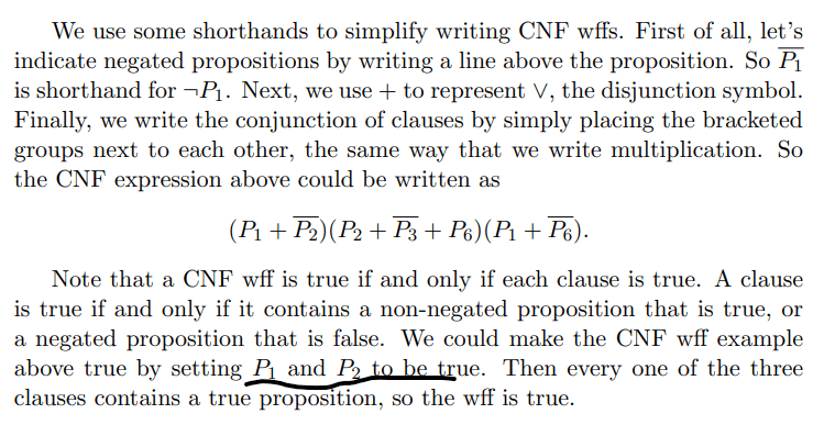 Does someone please know how setting ##P_1## and ##P_2## true makes the CNF true? If I see ##P_2## true, then it ##(true + false)## since it is negated. Therefore, should they be setting ##P_1## true and ##P_2## false?