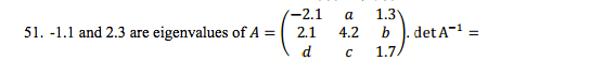 The discussion revolves around finding the determinant of an inverse matrix using eigenvalues, specifically in the context of a 3x3 matrix with some unknown coefficients. Participants are exploring the relationship between eigenvalues, determinants, and traces, while also addressing the challenges posed by missing information in the matrix.