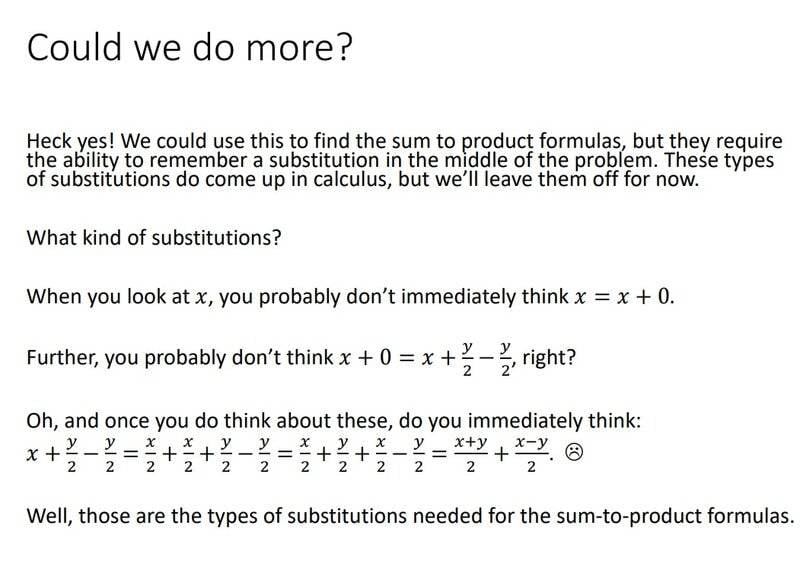 But when the author speak about sum to product formulas, he gave unclear hint and did not do the derivation. Please see attached.