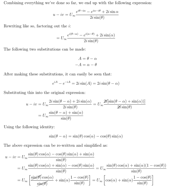 $$u-iv=U_{\infty}\frac{e^{-i\alpha}-e^{i\alpha -2i\theta}+2i\sin(\alpha)e^{-i\theta}}{1-e^{-2i\theta}}$$