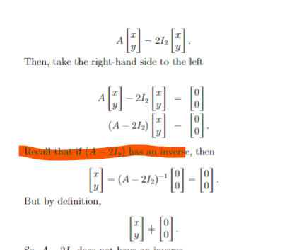 The discussion revolves around the concept of finding eigenvalues using the inverse of a matrix, specifically examining the expression \( A - 2I \) and its invertibility. Participants are exploring the implications of matrix inverses in the context of eigenvalue determination.