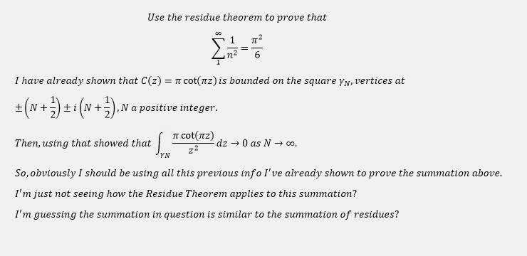 The discussion revolves around the use of the residue theorem in complex analysis, specifically in relation to the summation involving the function $\cot \pi z$. Participants explore the implications of singularities and residues in this context.