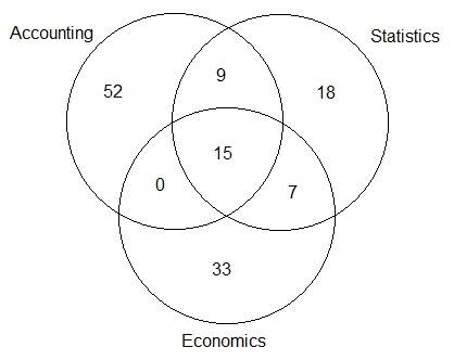 Of 150 students registered at a local university, 76 are attending an accounting course, 49 are taking statistics, 55 in economics, 24 attending the accounting and the statistics course, 22 registered in both statistics and economics courses and 15 are taking all three courses. (A Venn diagram may prove useful)
