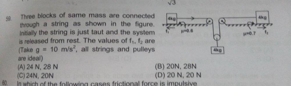 The discussion revolves around a problem involving a system of three blocks and the calculation of frictional forces and tensions in the ropes connecting them. Participants are analyzing the relationships between these forces and the resulting tensions based on free body diagrams.