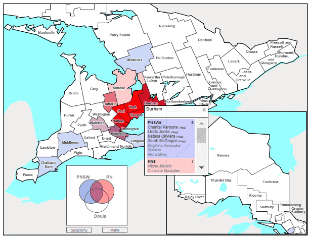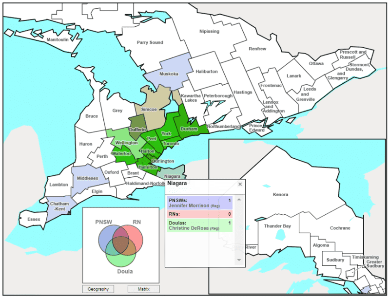 The Niagara county is serviced by one PNSW and one Doula, so its hotspot is a pale blue-green: