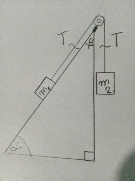 Say we have pulley at the top of an inclined plane with a base angle of alpha and the top angle is alpha.