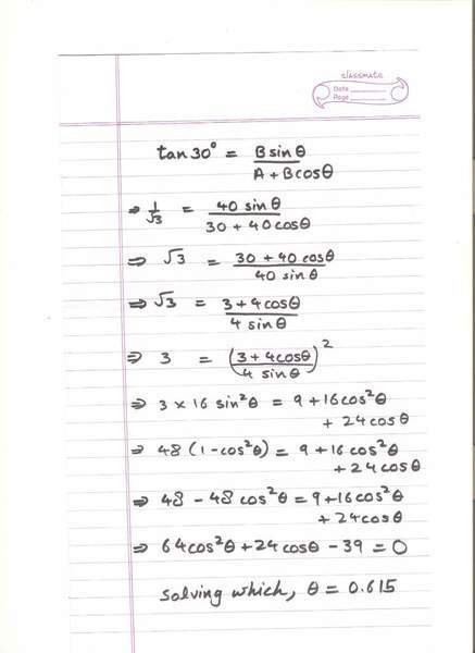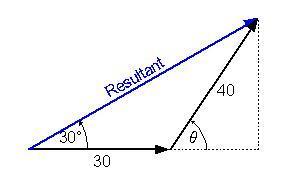 Two forces of 30N and 40N act on a particle such that the resultant vector makes an angle of 30 degrees with the first vector. What is the angle between the given vectors and magnitude of the resultant vector?