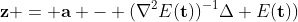 [URL]http://latex.codecogs.com/gif.latex?\mathbf{z}%20=%20\mathbf{a}%20-%20%28\nabla^2E%28\mathbf{t}%29%29^{-1}\Delta%20E%28\mathbf{t}%29%29[/URL]