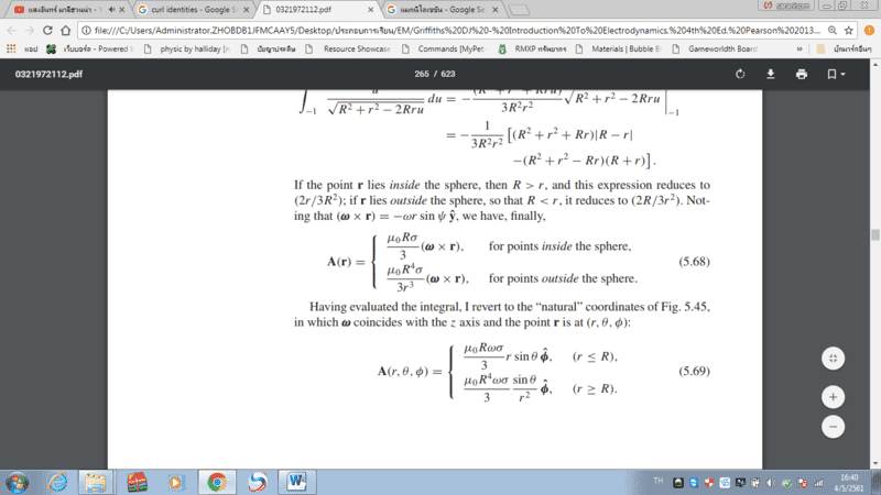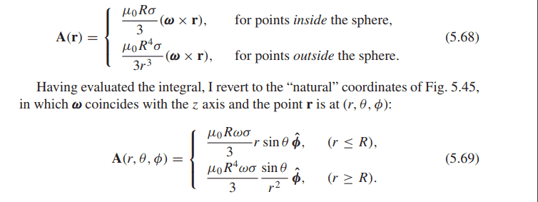 (inside) A = ⅓μ0Rσ(ω x r) = ⅓μ0Rσωrsin(θ) θ^