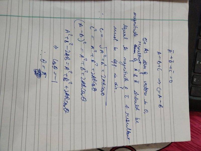 The discussion revolves around finding the angle between two vectors, A and B, given the equation A + B + C = 0, which implies A = B + C. Participants are exploring the relationships between these vectors in a three-dimensional space.