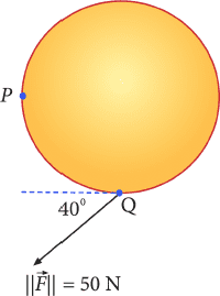 The problem involves calculating the torque generated by a force applied to a disk pinned at a point. The disk has a specified radius, and the force's magnitude and application point are given. The discussion revolves around determining the angle between the force vector and the position vector from the pivot point to the point of application.