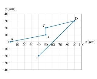 The bacterium Escherichia coli (or E. coli) is a single-celled organism that lives in the gut of healthy humans and animals. When grown in a uniform medium rich in salts and amino acids, these bacteria swim along zig-zag paths at a constant speed of 20\mum. The figure shows the trajectory of an E. coli as it moves from point A to point E. Each segment of the motion can be identified by two letters, such as segment BC.