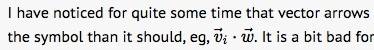 I have noticed for quite some time that vector arrows specified using the TeX command \vec result in a much larger white space after the symbol than it should, eg, ##\vec v_i \cdot \vec w##. It is a bit bad for readability and looks quite ugly. Can this be fixed?