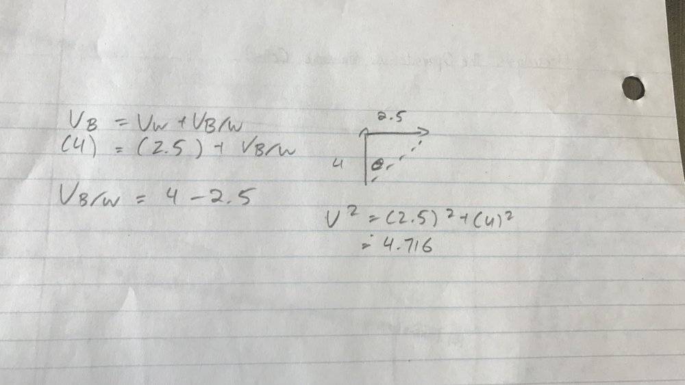 Bob can swim at 4 m/s in still water. He wishes to swim across a river 200 m wide to a point directly opposite from where he is standing. The river flows westward at 2.5 m/s and he is standing on the South bank of the river.