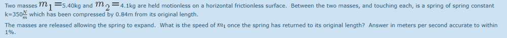 The discussion revolves around a physics problem involving the dynamics of two masses being propelled by a spring. The participants are examining the conversion of potential energy stored in the spring into kinetic energy of the masses, as well as the application of conservation of momentum principles.