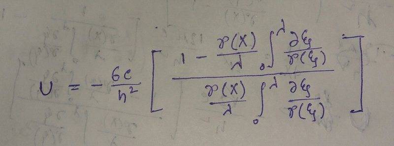 I get the following: $$U(X,Y)=6c\left[\frac{1-\frac{\rho (X)}{\lambda}\int_0^{\lambda}{\frac{d\xi}{\rho(\xi)}}}{\frac{\rho (X)}{\lambda}\int_0^{\lambda}{\frac{d\xi}{\rho(\xi)}}}\right]\left(\frac{Y}{h}-\left(\frac{Y}{h}\right)^2\right)+c$$big dream said: