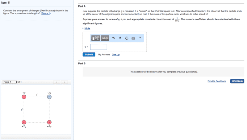 Now suppose the particle with charge q is released. It is "kicked" so that it's initial speed is v. After an unspecified trajectory, it is observed that the particle ends up at the center of the original square and is momentarily at rest. If the mass of this particle is m, what was its initial speed v?