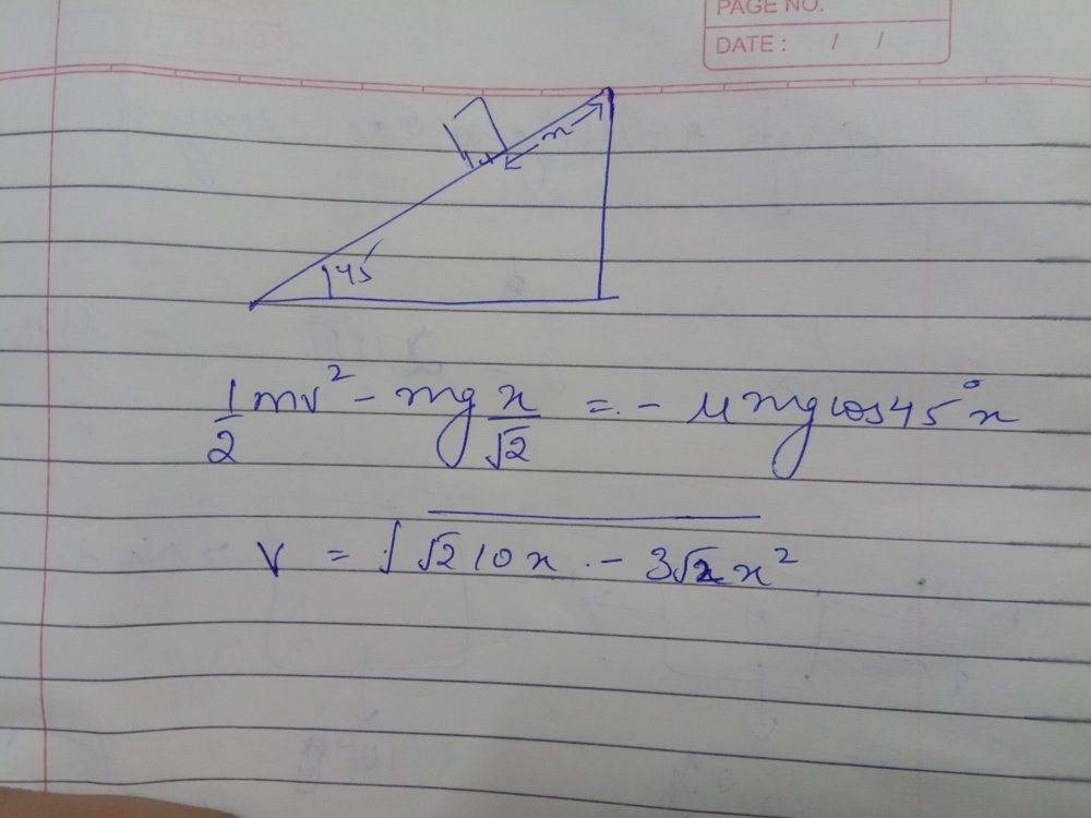 The discussion revolves around a problem involving the velocity of an object on an inclined plane, specifically analyzing the forces and energy involved as the object moves down the slope. The scenario includes a varying coefficient of friction and the application of the work-energy theorem.
