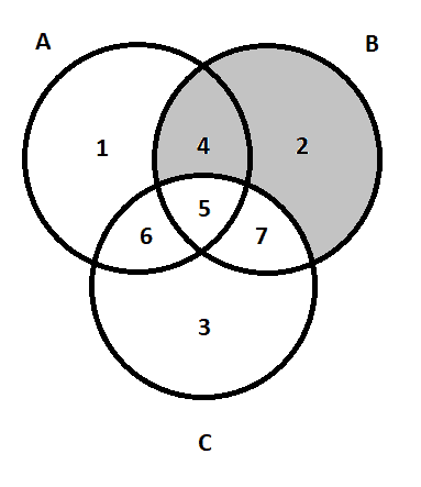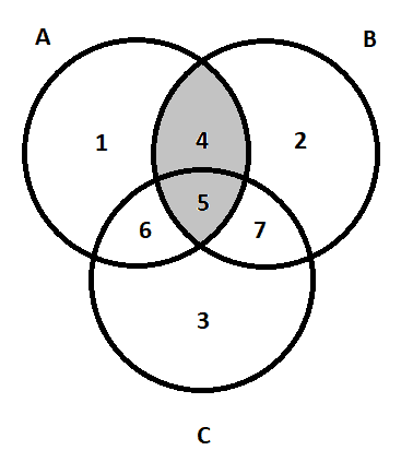 My question is, do i shade in region 5, even though [itex](B - C)[/itex] means "no elements in [itex]C[/itex]" but when I have to show [itex]A[/itex] and [itex]B[/itex] intersect, I shade in region 4 obviously, but does that include region 5 because that's also where [itex]A[/itex] and [itex]B[/itex] intersect, but [itex]C[/itex] is also intersecting there as well.