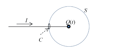 A current I flows along a wire toward a point charge, causing the charge to increase with time. Consider a spherical surface S centred at the charge, with a tiny hole where the wire is – see figure below. The circumference C of this hole is the boundary of the surface S. Verify that the integral form of Maxwell’s equation