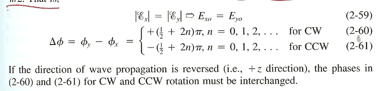 The book claimed for propagation in -ve z direction, if phase is +∏/2 (n=0), the rotation is CW which is Left Hand Rotation. And the book said if the propagation is in +ve z direction, the rotation reverse to CCW.
