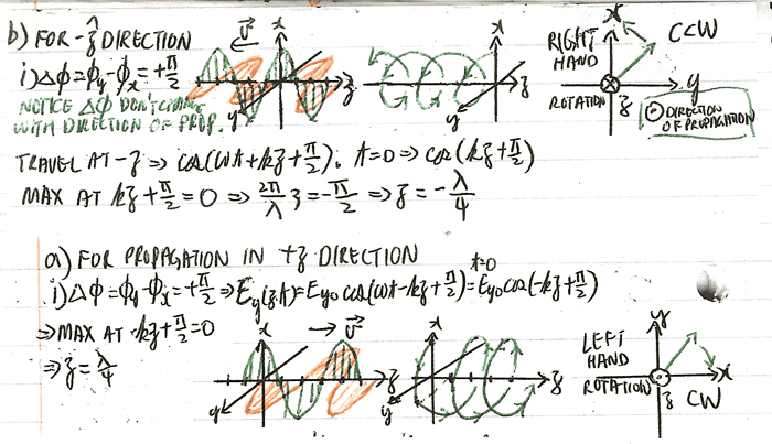 But as I proofed in my notes: For propagation in -ve z direction, the function is \cos(\omega{t}+kz+\frac{\pi}{2}). Which for t=0 and plot the wave along -z, maximum occur at kz+\frac{\pi}{2}\;=\;0\;\Rightarrow\; z=-\frac{\lambda}{4}. This is drawn in my notes. I showed the rotation of the E in CCW and is Right Hand Rotation for propagation in -ve z direction.